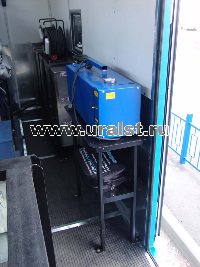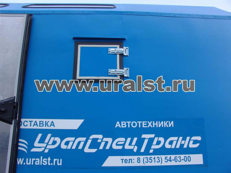 Кузов-фургон представляет собой каркасную сварную конструкцию, наружная обшивка – стальной лист, в качестве утеплителя используется пенополистерол. В зависимости от назначения и климатических условий эксплуатации толщина стеновых панелей может быть от 30 до 80 мм. Внутренняя отделка кузова-фургона выполнена промышленным пластиком. Нижняя часть стен АРСа обшита оцинкованным стальным листом, пол покрыт рифленой резиной. Такой вариант отделки более практичен для ремонтных работ. Окна с двойным остеклением, окантованные резиновым профилем в кол-ве 4 шт. расположены на скосах фургона. Для увеличения тепло- и шумоизоляции проемы дверей и люков окантовываются двойным уплотнителем.