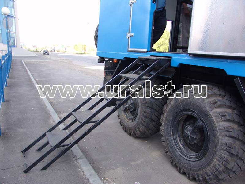 Одной из особенностей агрегата ремонтно-сварочного являются выдвижной трап, по которому осуществляется вход персонала внутрь фургона, и съемная лестница, обеспечивающая свободный доступ к люкам. Для удобства и экономии пространства, трап, как и лестница, в транспортном положении убирается в нишу под полом автофургона. Конструкция лестницы и трапа предусматривает широкие ступеньки, по которым легче производить спуск и подъем.
