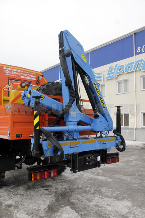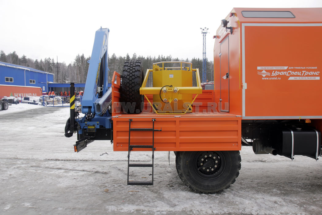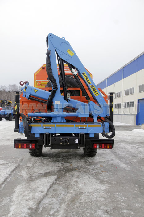 На заднем свесе автофургона смонтирована крано-манипуляторная установка ИМ-55для проведения грузоподъемных работ весом до 2,05 тонн.