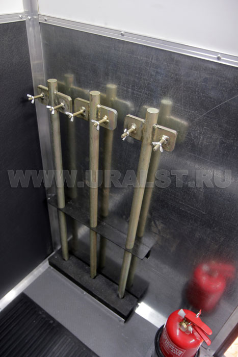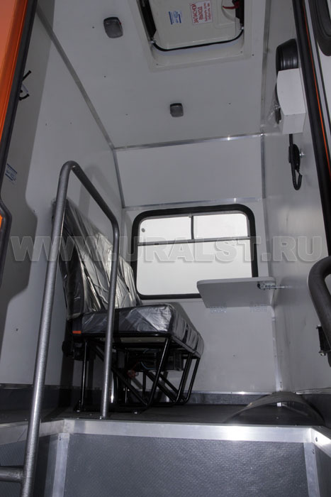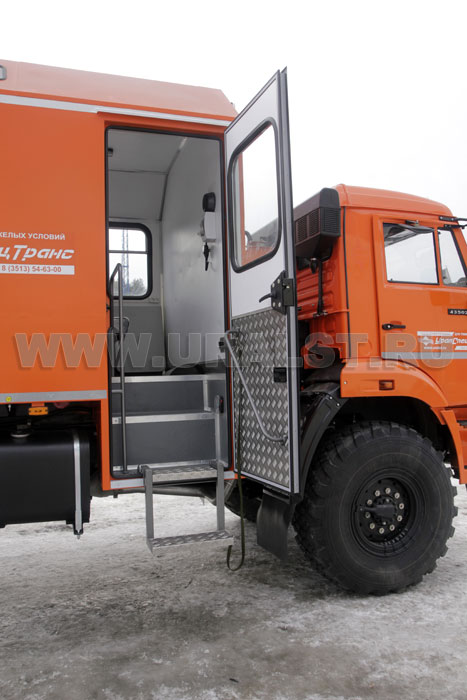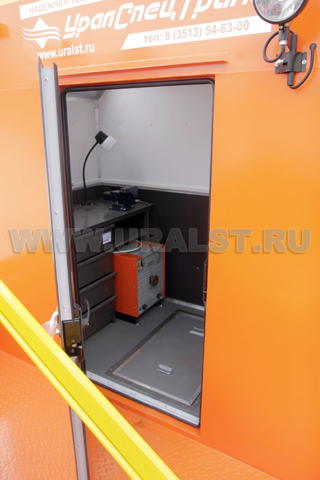 Вход в ремонтный отсек осуществляется c бортовой платформы. Агрегат ремонта и обслуживания станков-качалок оснащен необходимым оборудованием и инвентарем.