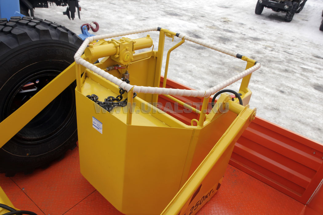 Для избежания перемещения груза во время транспортировки предусмотрены специальные петли для увязки груза. На площадке расположена корзина для подъема людей (люлька).