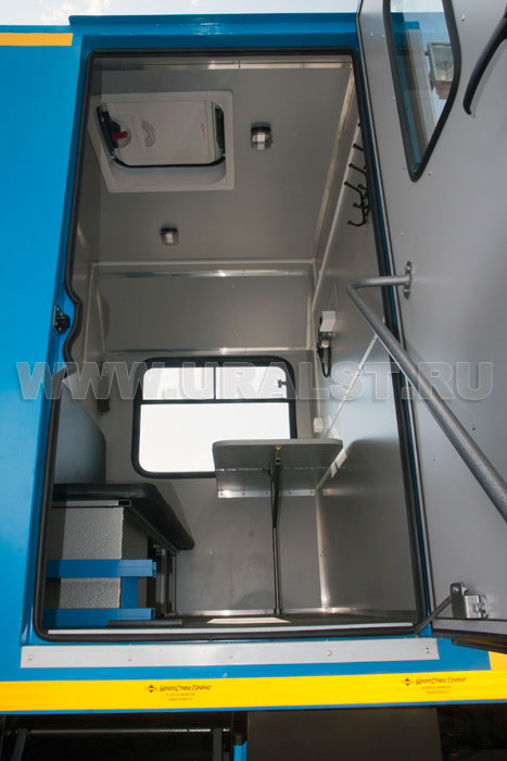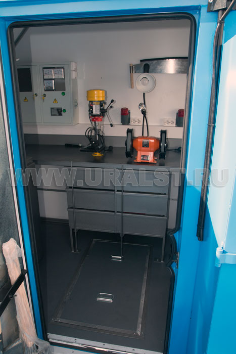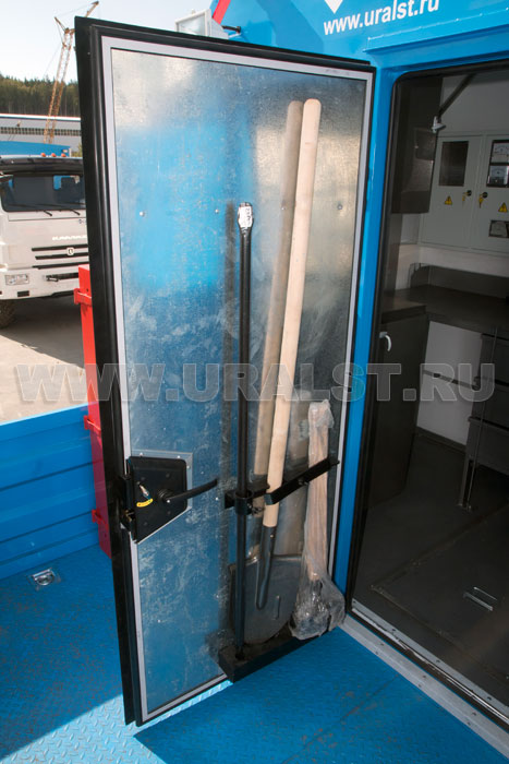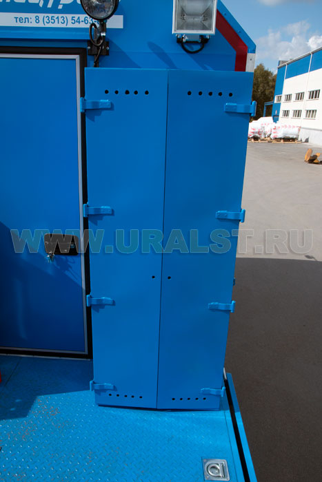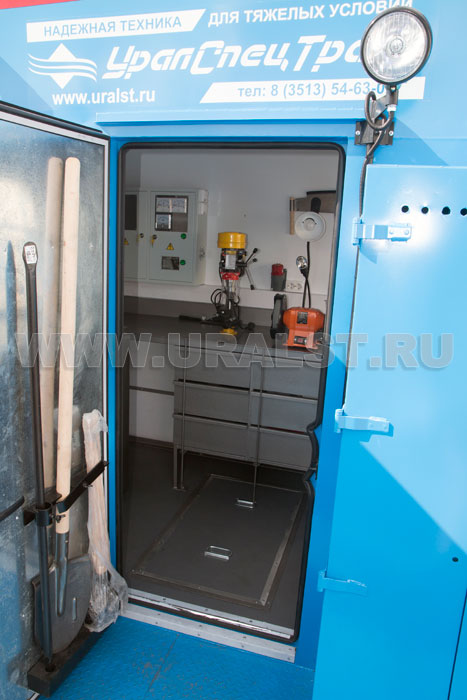 Вход в ремонтный отсек осуществляется c бортовой платформы. Агрегат ремонта и обслуживания станков-качалок оснащен необходимым оборудованием и инвентарем.