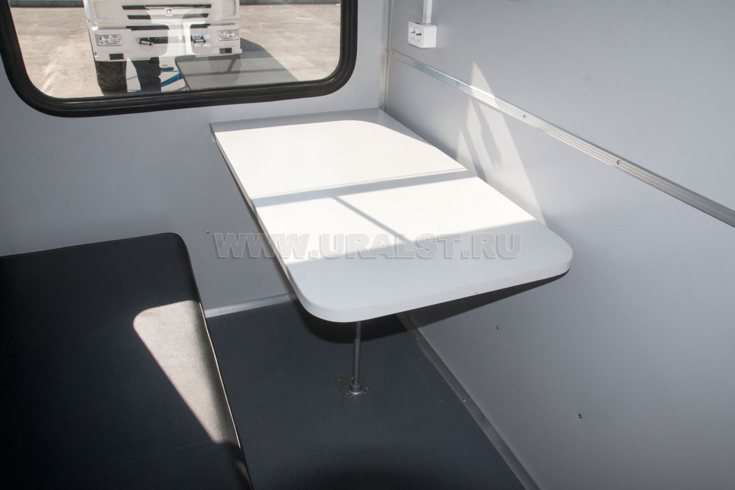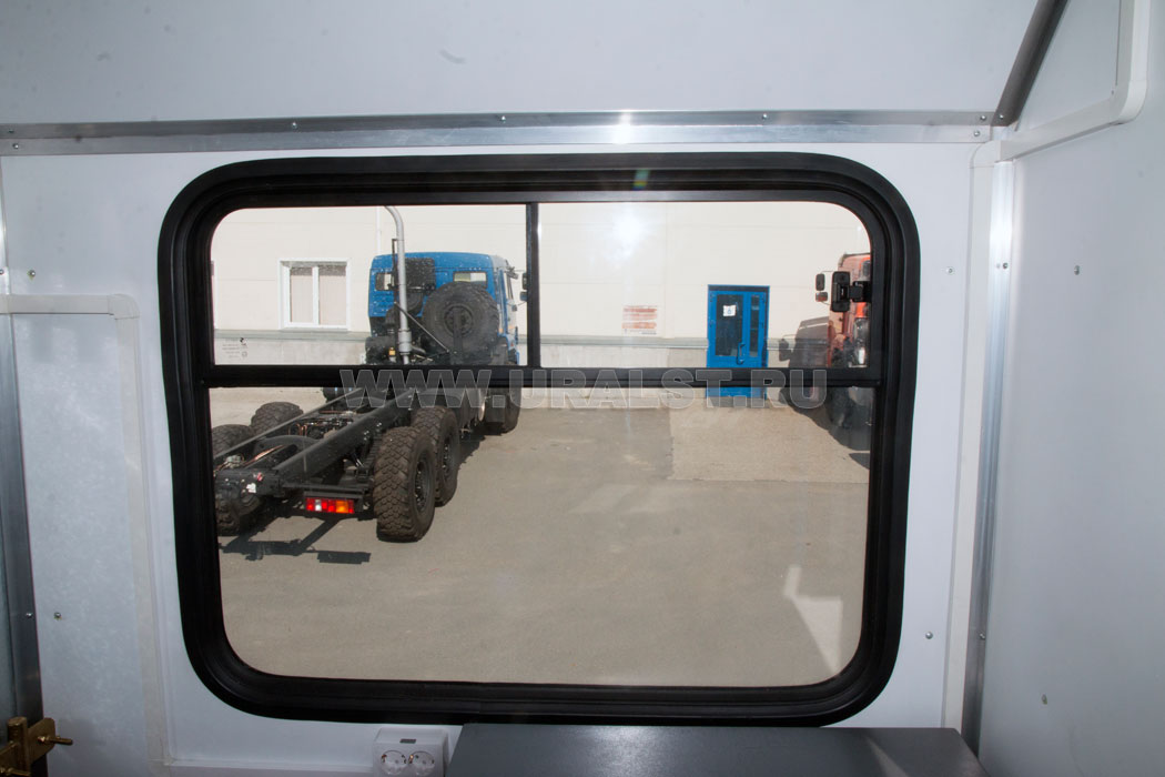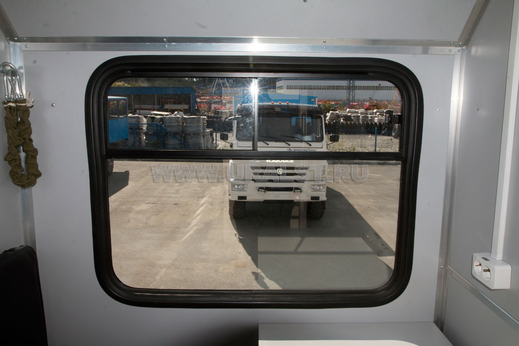 Фургон оборудован окнами с форточками с применением двойного герметичного стеклопакета, обеспечивающими естественное освещение, вентиляцию и необходимый обзор. Окна изготовлены из травмобезопасного стекла и окантованы уплотнителем.