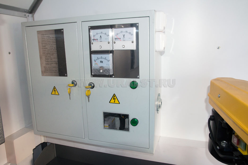 Защита потребителей и цепей 380В и 220В от перегрузок и короткого замыкания обеспечивается соответствующими автоматическими выключателями и модулем защитного отключения установленным в шкафу управления. Напряжение 24В постоянного тока подается из электрической схемы базового автомобиля.