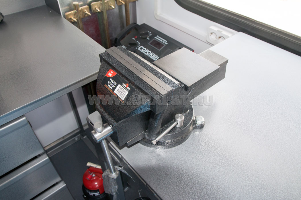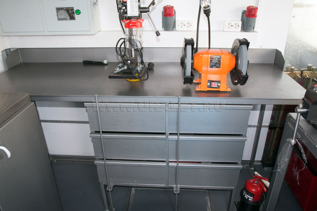 Планировка и расположение оборудования произведены с учетом максимально полезного использования пространства масерской и удобства работы персонала. Все оборудование и инструмент надежно закреплены на штатных местах.