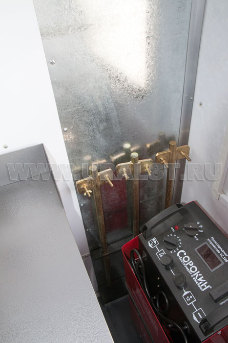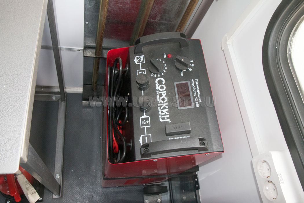 Фургон оборудован розетками для подключения потребителей 220 и 380V. Для работы в темное время суток все рабочие места фургона оборудованы плафонами освещения и настольным светильником.