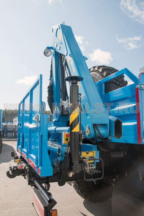 На заднем свесе агрегата ремонта и обслуживания станков-качалок установлена крано-манипуляторная установка ИМ-55, обеспечивающая проведение грузоподъемных работ с весом до 2,05 тонн.