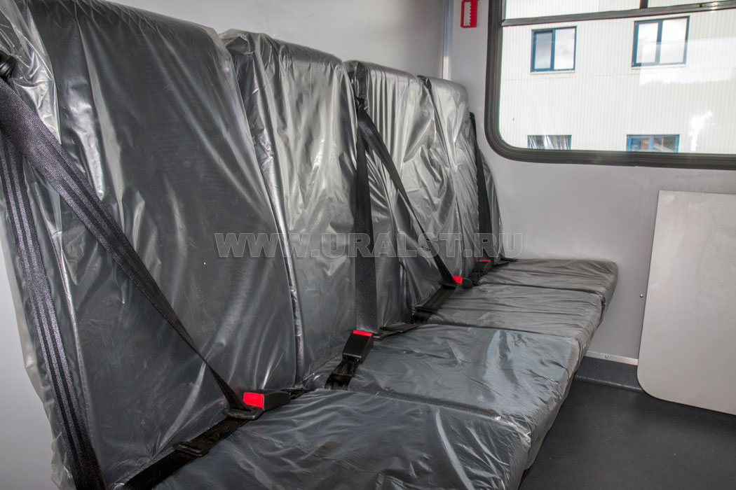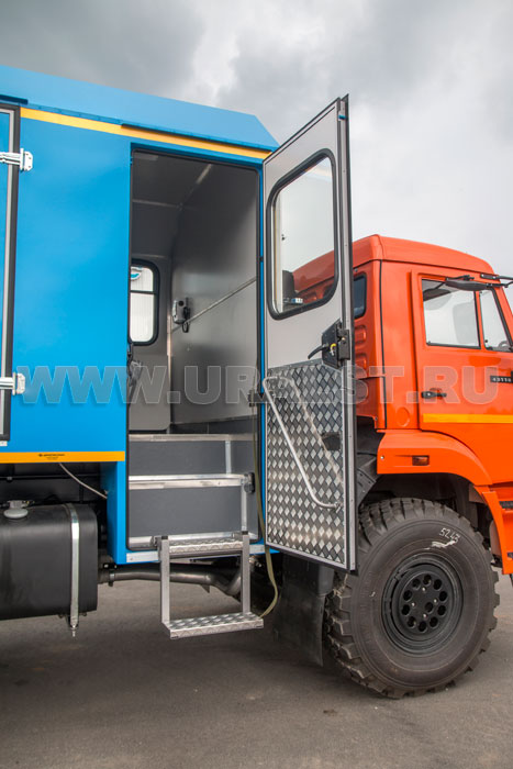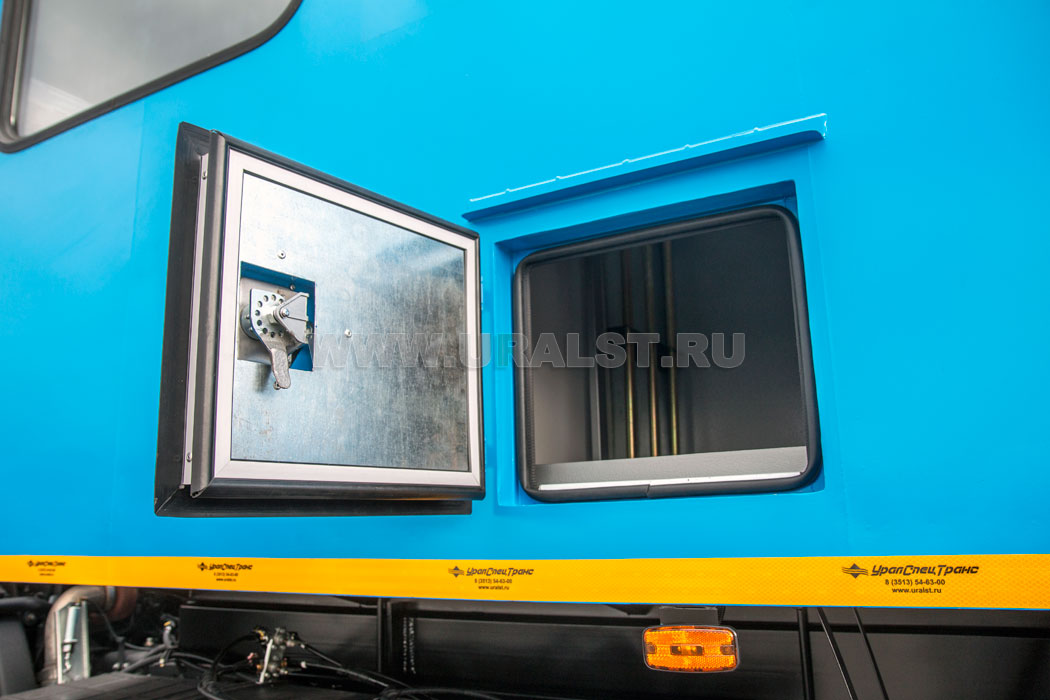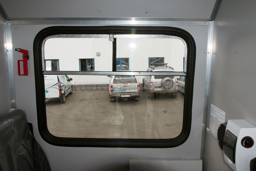 Фургон оборудован окном вахтового типа и окнами двойного остекления на скосах фургона, обеспечивающими естественное освещение, вентиляцию и необходимый обзор. Окна изготовлены из травмобезопасного стекла и окантованы уплотнителем.