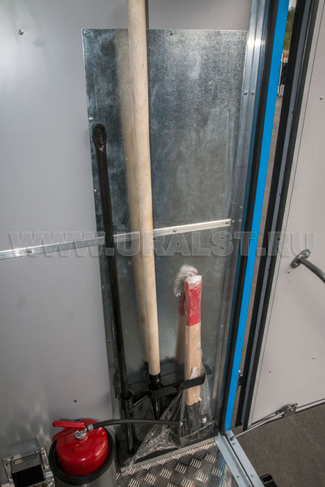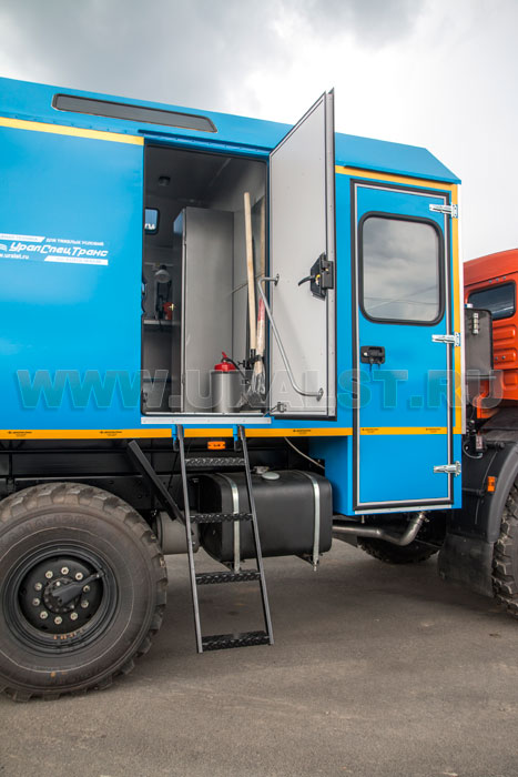 Вход в ремонтный отсек осуществляется по откидной лестнице. Агрегат ремонта и обслуживания станков-качалок (АРОК) может быть оснащен всем необходимым оборудованием и инвентарем.