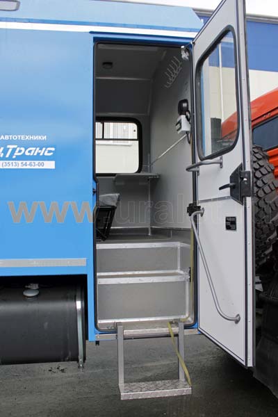 Обниженный вход в совокупности с откидной двухступенчатой лестницей обеспечивают максимальное сочетание удобства посадки пассажиров и компактность в транспортном положении. Минимальное расстояние от земли до нижней ступеньки достигается увеличенной длиной лестницы. Ступеньки лестницы выполнены их листа рифленой нержавеющей стали. Для поднятия лестницы в транспортное положение из салона вахтового автобуса предусмотрена специальная лента. Для освещения ступенек лестницы в темное время суток входная группа оснащается плафоном подсветки.