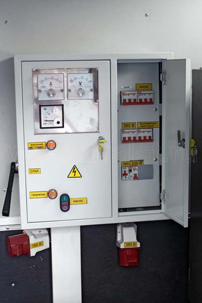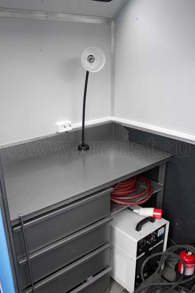 Фургон оборудован розетками для подключения потребителей 220 и 380V. Для работы в темное время суток все рабочие места фургона оборудованы плафонами освещения.