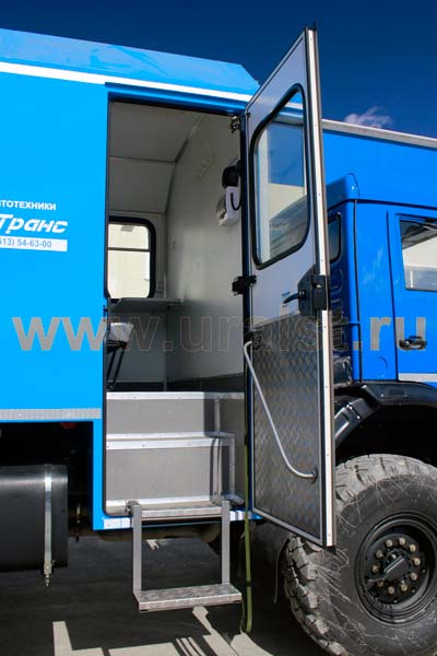 Обниженный вход в совокупности с откидной двухступенчатой лестницей обеспечивают максимальное сочетание удобства посадки пассажиров и компактность в транспортном положении. Ступеньки лестницы выполнены их листа рифленой нержавеющей стали. Лестница оборудована поручнем. Для освещения ступенек лестницы в темное время суток входная группа оснащается плафоном подсветки.
