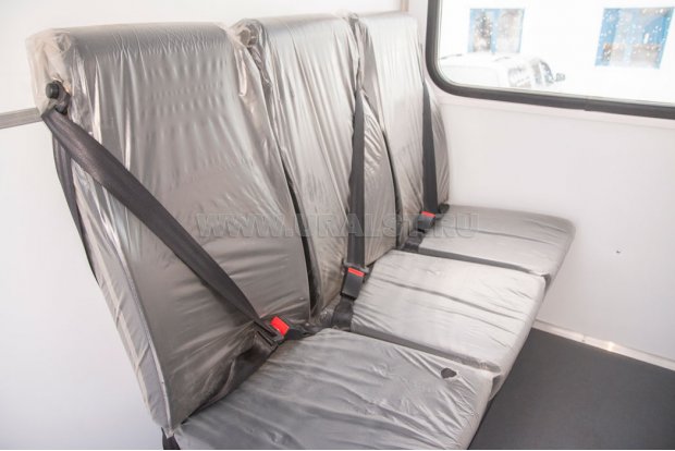 АРОК рассчитан на перевозку 3 человек в кузове-фургоне. Салон оборудован трехместными сиденьями с ремнями безопасности, вешалкой для одежды.