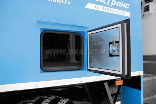 Вход в ремонтный отсек осуществляется по бортовой платформе. Агрегат ремонта и обслуживания станков-качалок (АРОК) может быть оснащен всем необходимым оборудованием и инвентарем.