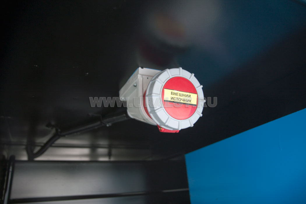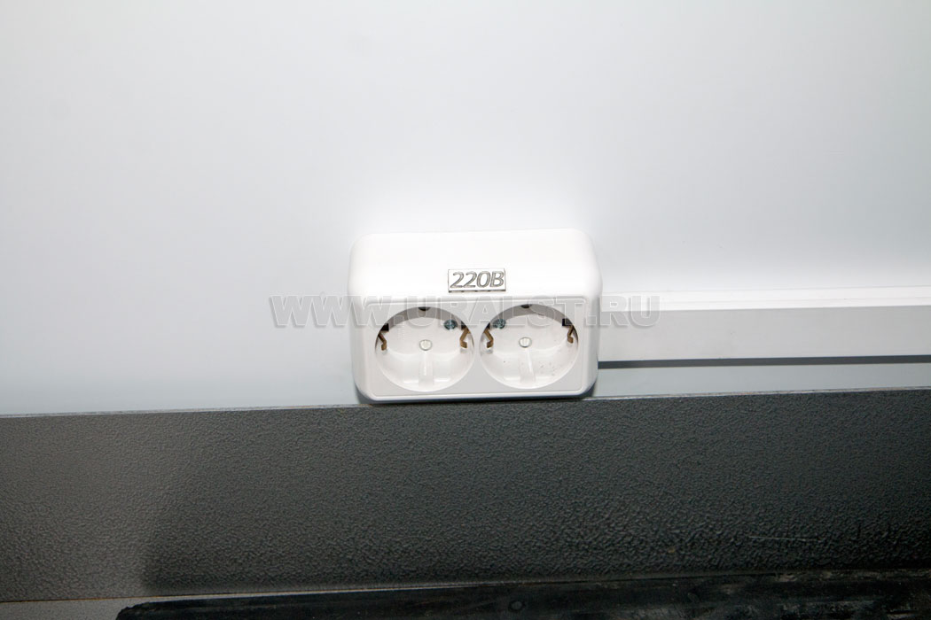 Фургон оборудован розетками для подключения потребителей 220 и 380V. Для работы в темное время суток все рабочие места фургона оборудованы плафонами освещения.