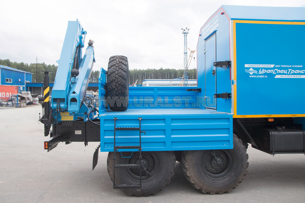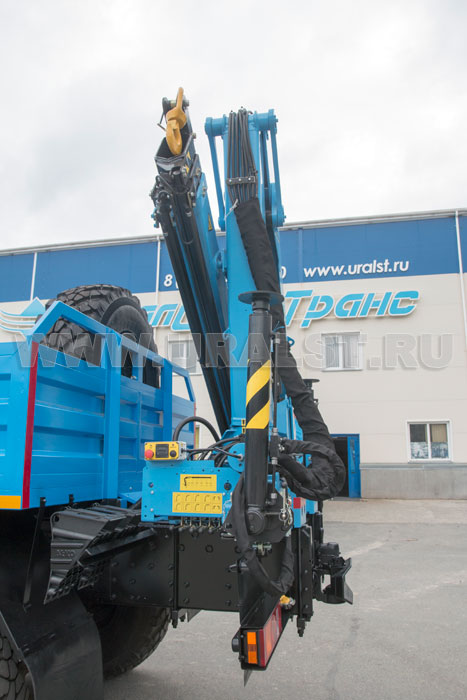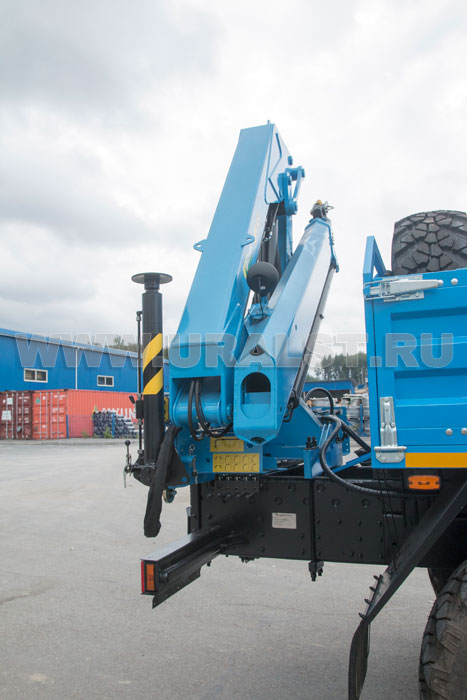 На заднем свесе агрегата ремонта и обслуживания станков-качалок Урал установлен кран-манипулятор ИМ-95, обеспечивающий проведение грузоподъемных работ с весом до 4 тонн.