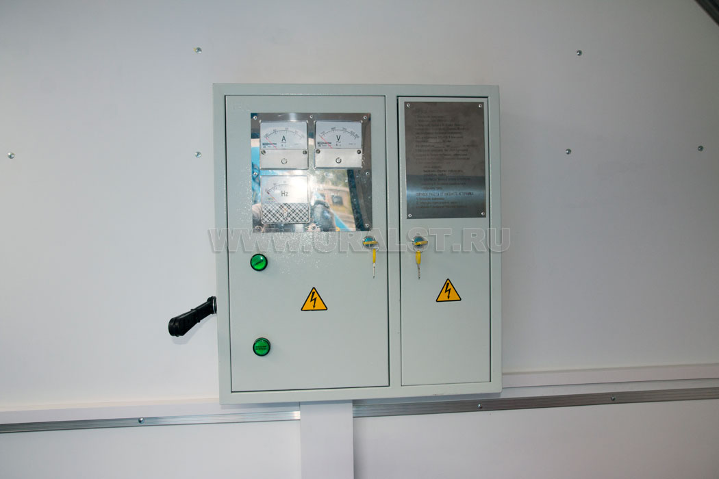 Питание оборудования АРОК Урал осуществляется от генератора мощностью 28 кВА, установленного на раме автомобиля под кузовом-фургоном, а также от внешнего источника питания, для подключения которого предусмотрен специальный разъем.