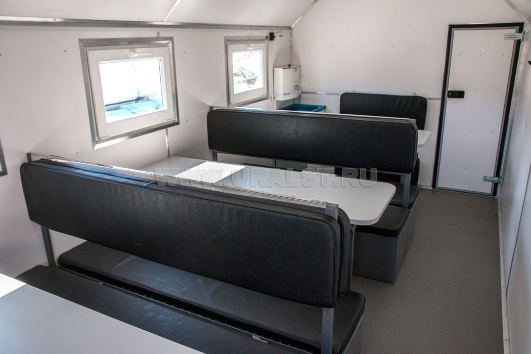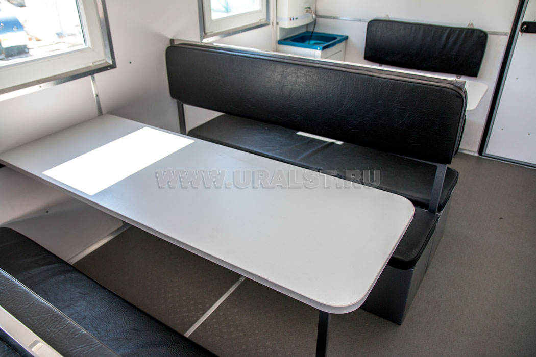 Кузов-фургон Столовой разделен на два отсека: отсек приема пищи и отсек выдачи. Отсек приема пищи оборудован диванами-рундуками, двумя откидными скамейками, столами и вешалками для одежды. Также в кузове фургоне установлены два умывальника с подогревом воды для большего комфорта пассажиров.