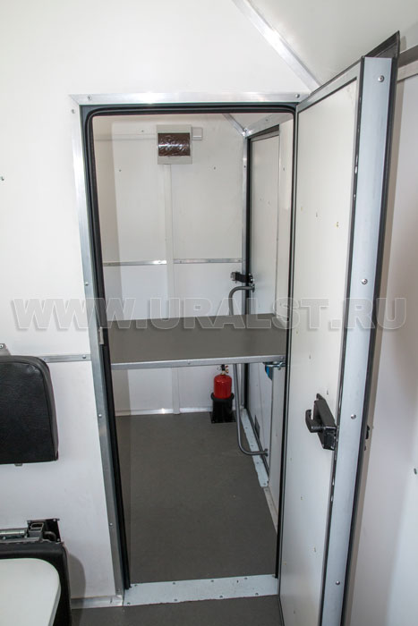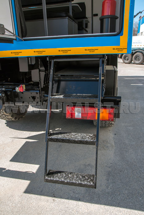 Вход персонала внутрь фургона осуществляется по выдвижной лестнице. Для удобства и экономии пространства трап в транспортном положении убирается в нишу под полом автофургона. Конструкция предусматривает широкие ступеньки, по которым легче производить спуск и подъем. Ступеньки трапа изготовлены из стального листа с рифленой поверхностью, что исключает случайное соскальзование ноги.