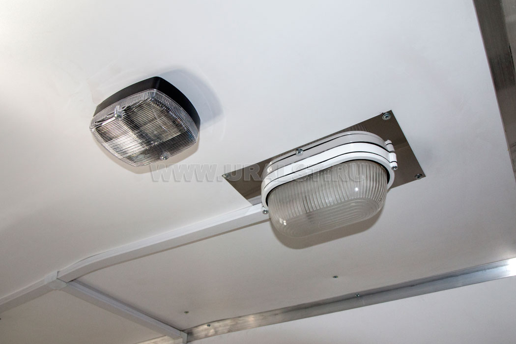 Фургон комплектуются необходимым количеством светильников: обычно используются пыле- и влагозащищенные люминесцентные светильники. Возможна установка специальных светильников, исходя из требований для различных классов пожаровзрывобезопасности помещений.
