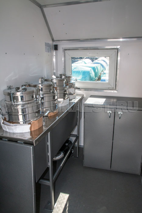 Полевая кухня оборудована евроокнами с форточками изготовлеными с применением двойного герметичного стеклопакета из травмобезопасного стекла с уплонителем.