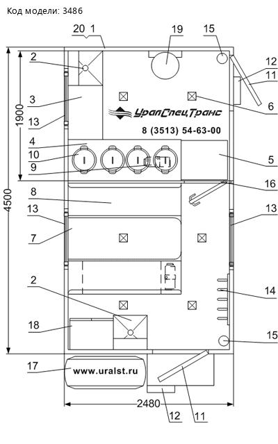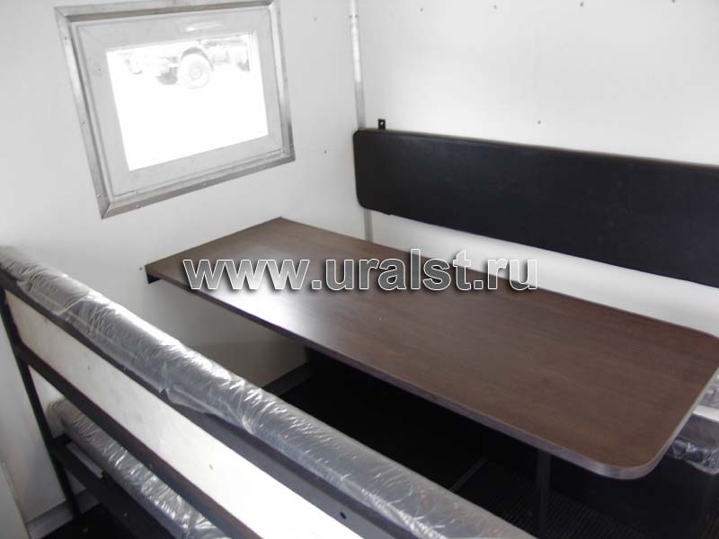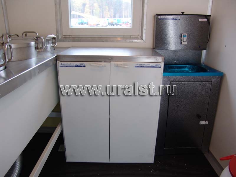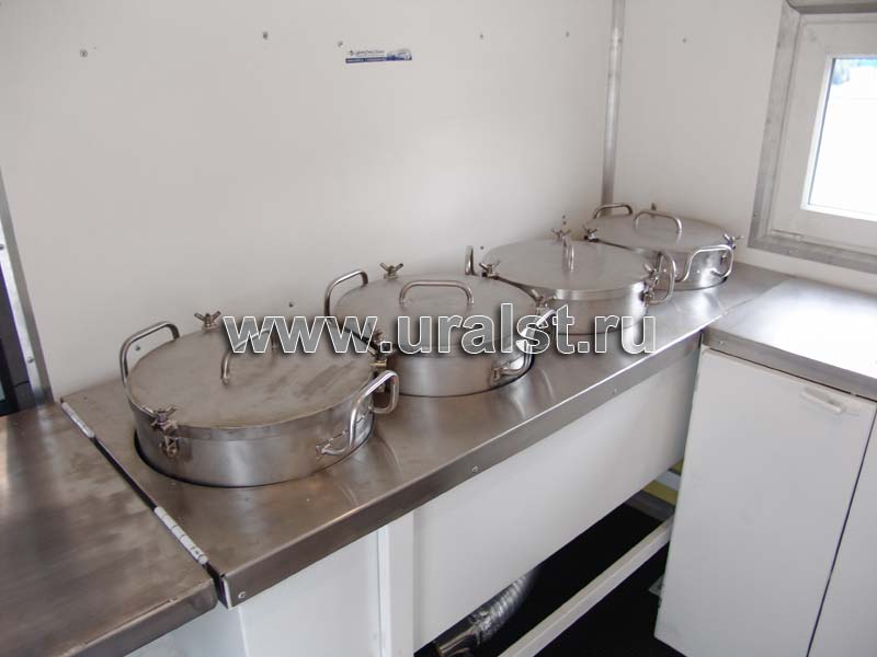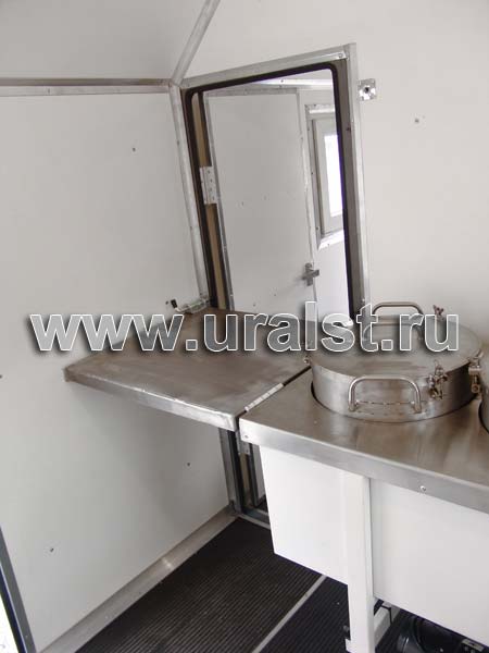 Мобильная столовая рассчитана на 6 посадочных мест, оборудована 2 умывальниками и отсеком-раздачей пищи. Отсек-столовая и отсек-раздача разделены распашной дверью. В отсеке-раздаче смонтирован воздушный отопитель, выполняющий функцию поддержания необходимой температуры пищи. Также воздушным отопителем оснащена столовая.