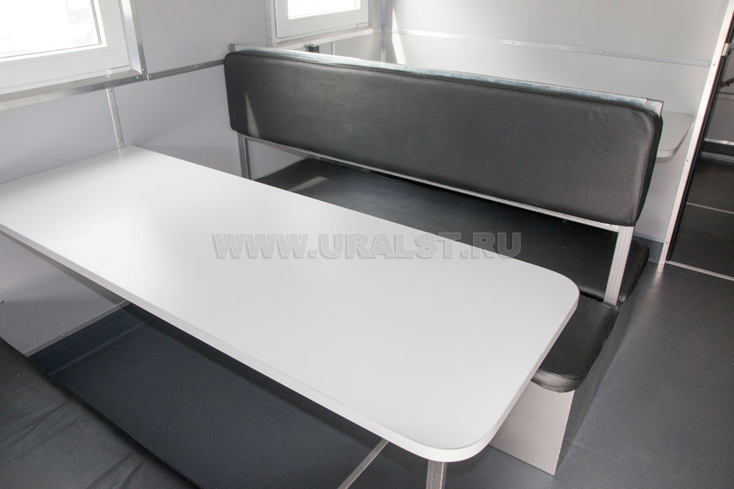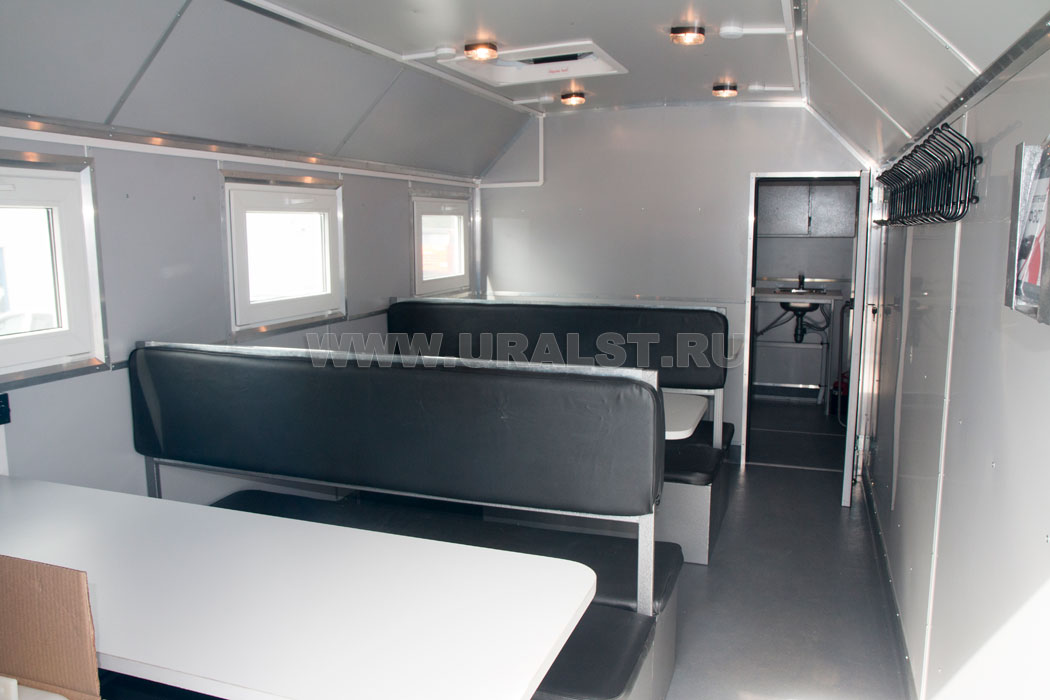 Кузов-фургон Столовой разделен на два отсека: отсек приема пищи и отсек выдачи. Отсек приема пищи оборудован диванами-рундуками, двумя откидными скамейками, столами и вешалками для одежды. Также в кузове фургоне установлен умывальник с подогревом воды для большего комфорта пассажиров.