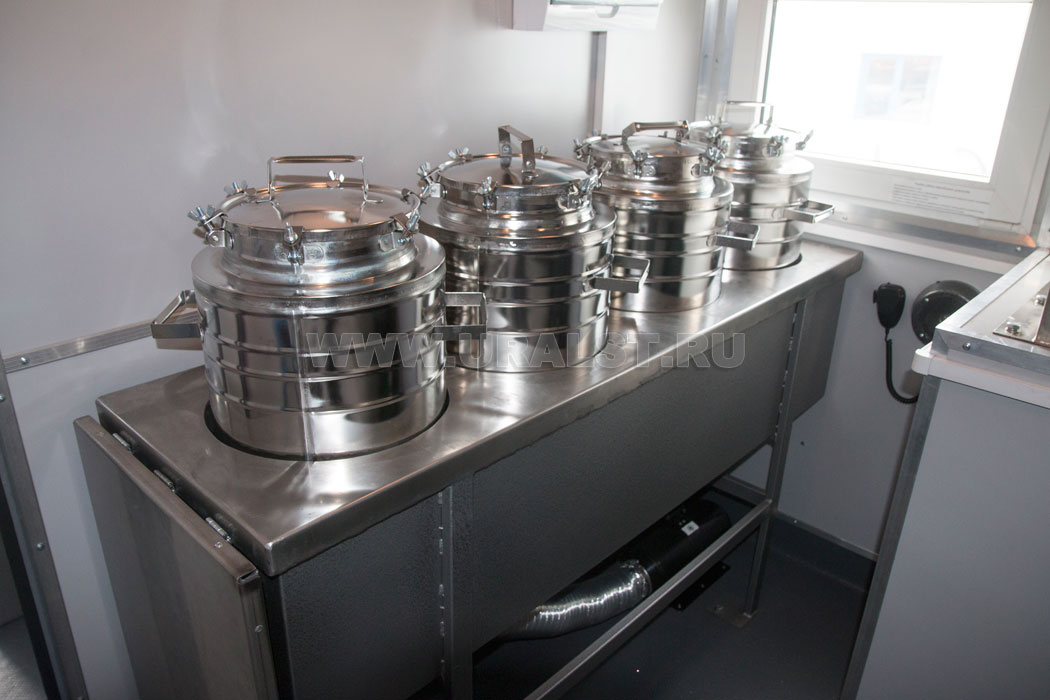 Отсек выдачи оборудован столом-тумбой для столовых приборов и столом для подогрева пищи, который укомплектован емкостями для пищи. Подогрев пищи происходит за счет автономного отопителя Планар, установленного в отсеке, который с помощью гофры соединен с емкостями. Остальные два отопителя установлены в отсеке приема пищи и выполняют функцию поддержания необходимой температуры. Автономные воздушные отопители Планар-4Д-24 используют собственный источник питания и независимы от штатной системы отопления.