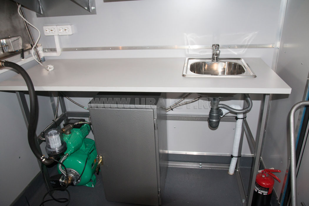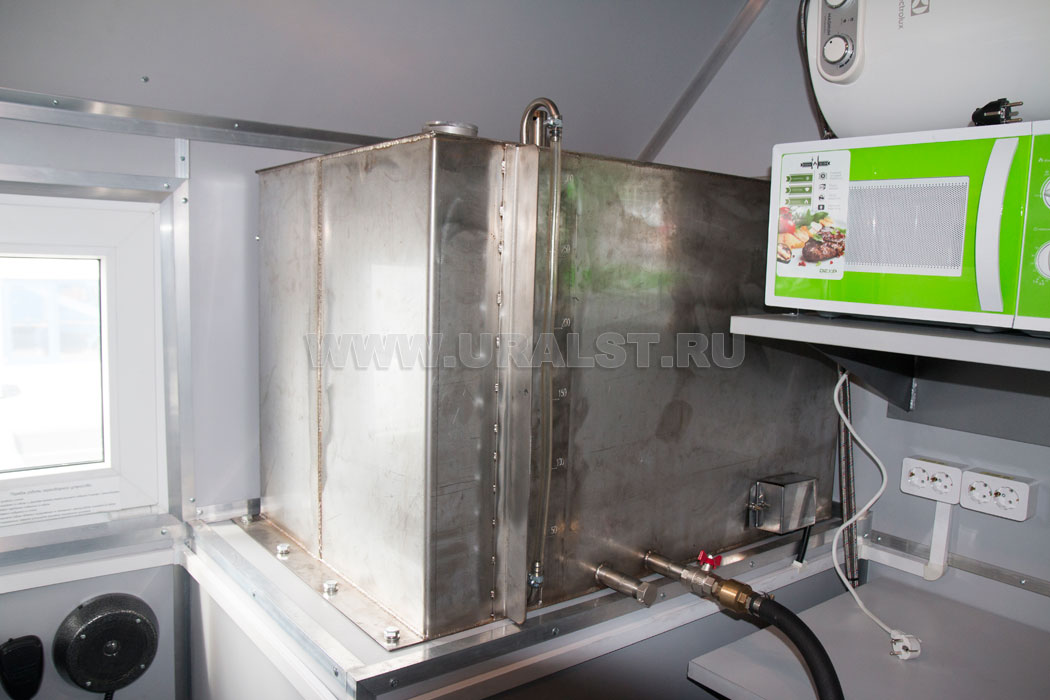 Кузов-фургон представляет собой сварной каркас, обшитый снаружи стальным листом, внутри – свет-лым пластиком. Пространство между внешней и внутренней обшивкой фургона заполнено слоем теплоизоляционного материала. В мобильной столовой используется только качественная автомобильная фурнитура ведущих европейских производителей. Отделка стен и потолка фургона высококачественным автомобильным пластиком, а также износостойкое полимерное покрытие пола обеспечивают красивый внешний вид и долгий срок эксплуатации.
