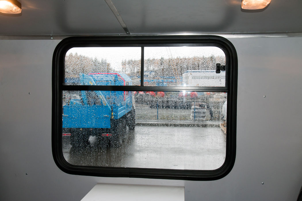 Окно салона ГПА УСТ изготовлено с применением двойного герметичного стеклопакета из травмобезопасного стекла и оконтовано уплотнителем. Окно оборудовано форточкой.
