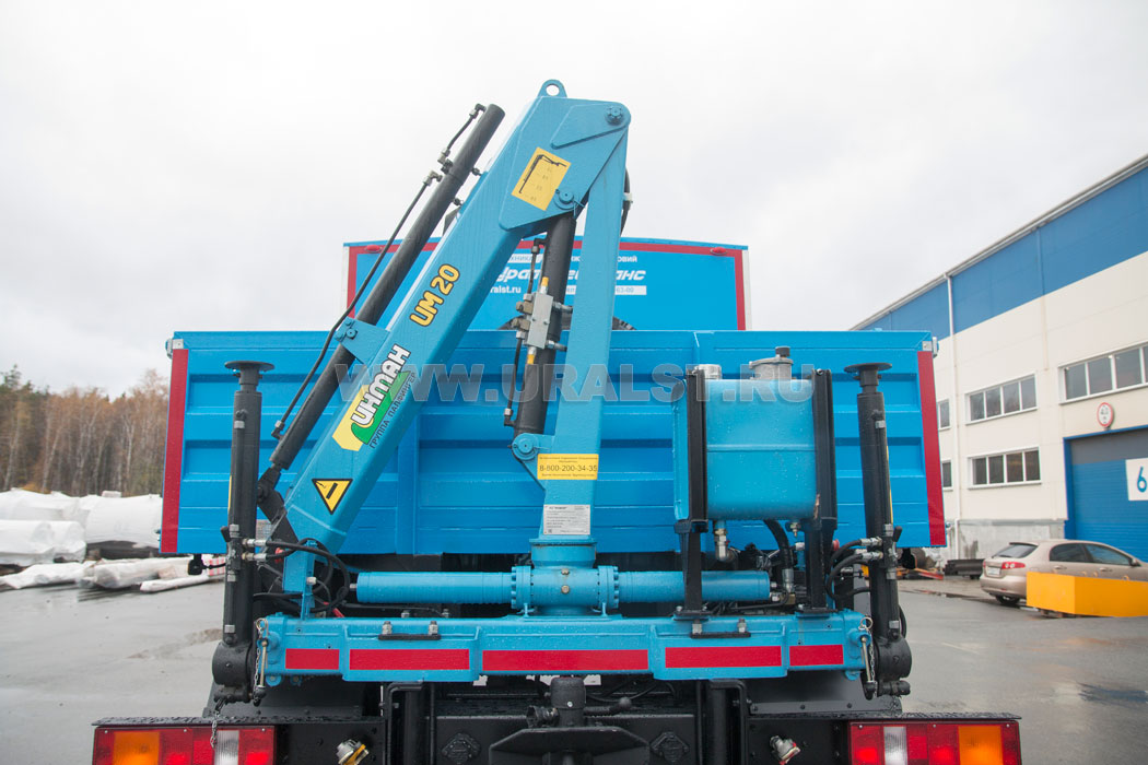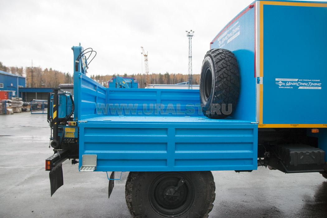 На заднем свесе фургона установлен манипулятор ИМ-20 для проведения грузоподъемных работ.