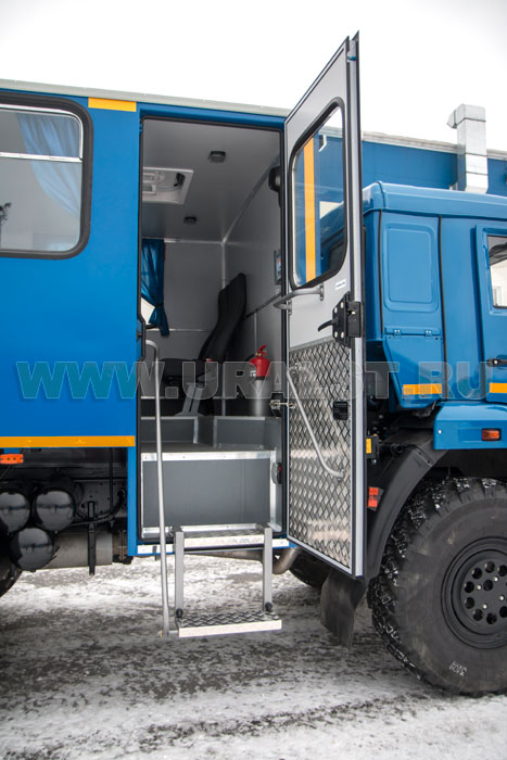 Обниженный вход в совокупности с откидной двухступенчатой лестницей обеспечивают максимальное сочетание удобства посадки пассажиров и компактность в транспортном положении. Ступеньки лестницы выполнены из листа рифленой нержавеющей стали. Для облегчения входа и выхода пассажиров лестница оборудована поручнем. Для освещения входной группы при посадки и высадки пассажиров устанавливается плафон подсветки.