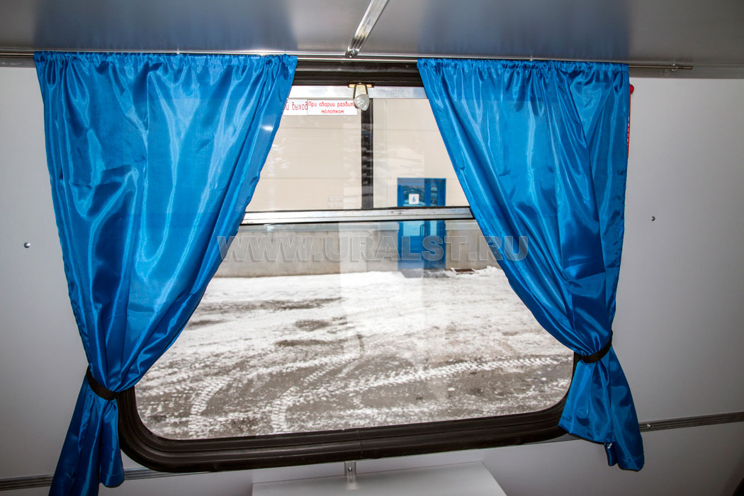 Окно салона ГПА УСТ изготовлено с применением двойного герметичного стеклопакета из травмобезопасного стекла и оконтовано уплотнителем. Окно оборудовано форточкой и шторкой.