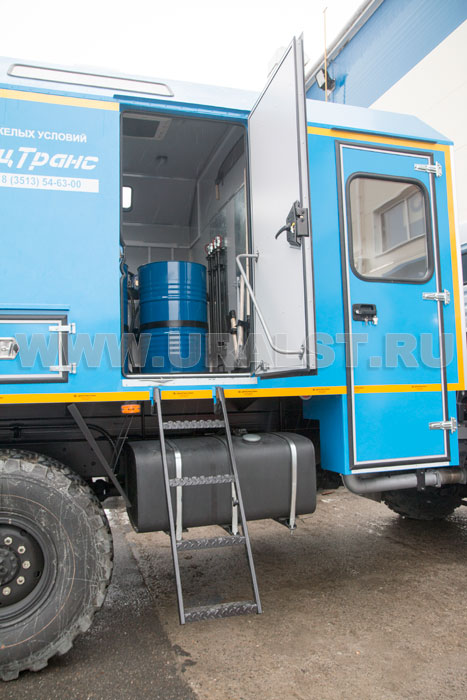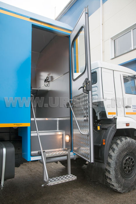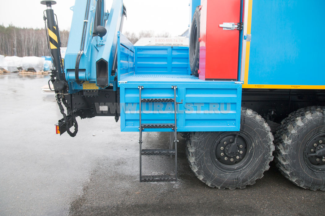 Вход в бытовой отсек осуществляется по откидной лестнице. Ступеньки лестниц изготовлены из стального рифленого листа, что исключает случайное соскальзывание ноги. Для входа в ремонтный отсек предусмотрена навесная лестница. Подъем на грузовую платформу осуществляется по лестнице, закрепленной на борту грузовой платформы.