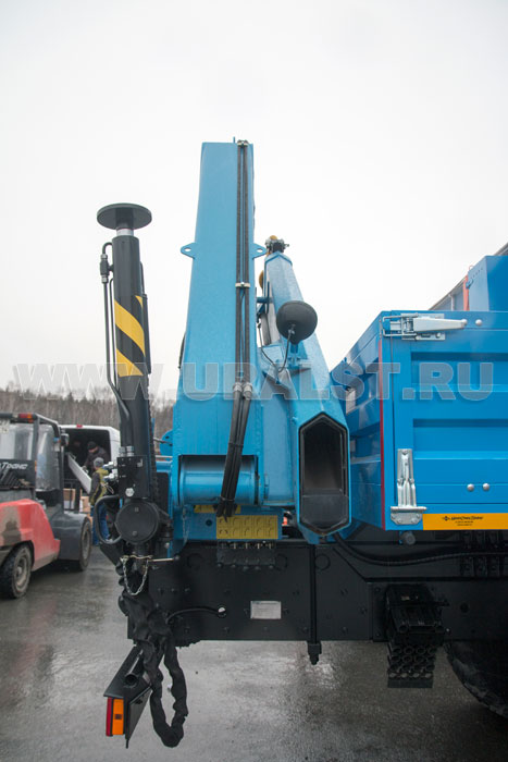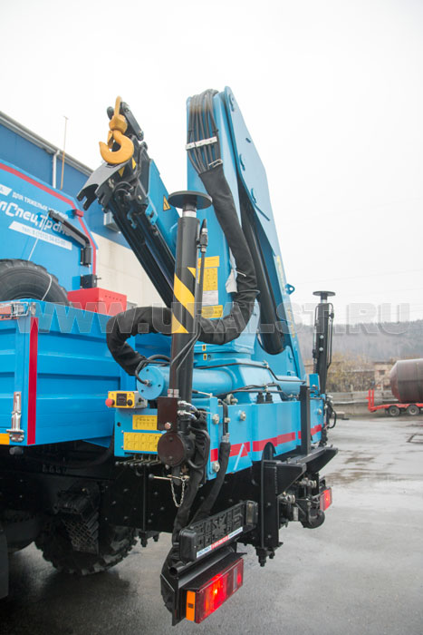 На заднем свесе автомобиля Камаз ПАРМ установлен кран-манипулятор ИМ-150 обеспечивающий проведение грузоподъемных работ с весом до 6,05 тонн.