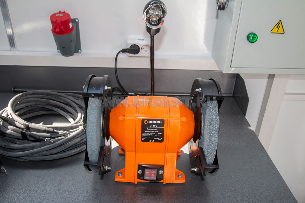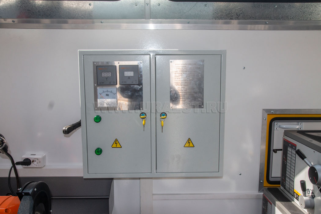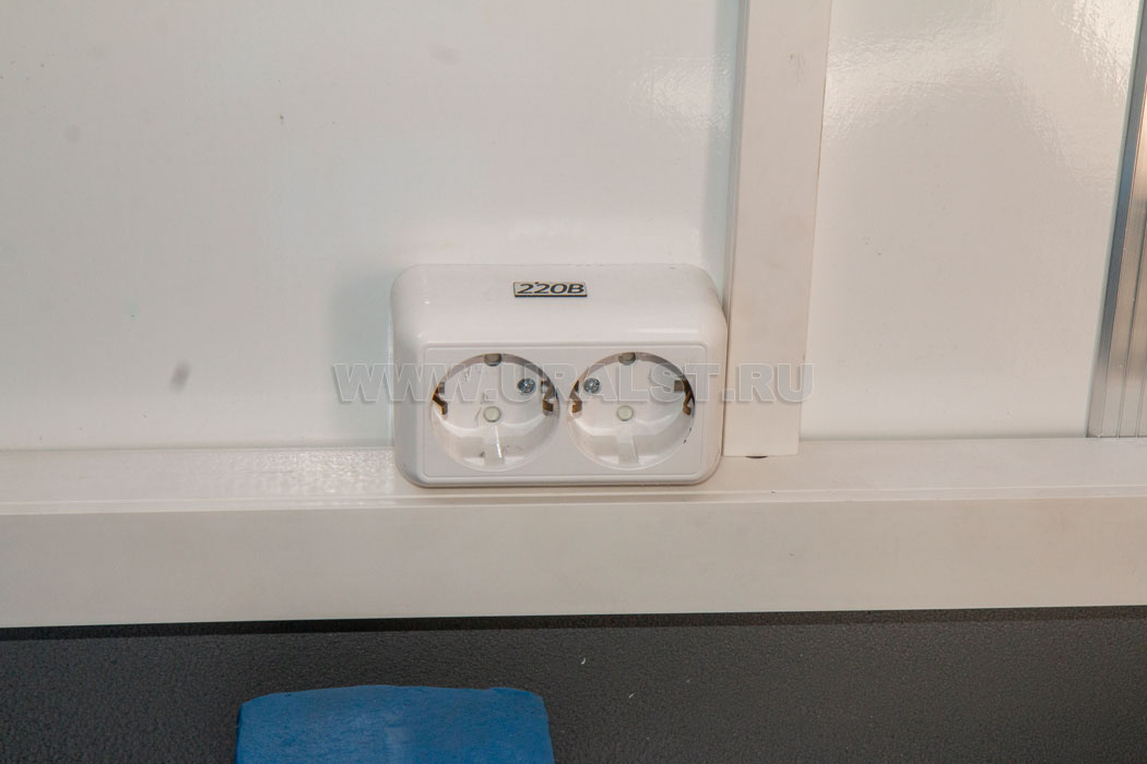 Фургон оборудован розетками для подключения потребителей 220 и 380V. Для работы в темное время суток все рабочие места фургона оборудованы плафонами освещения и настольным светильником.