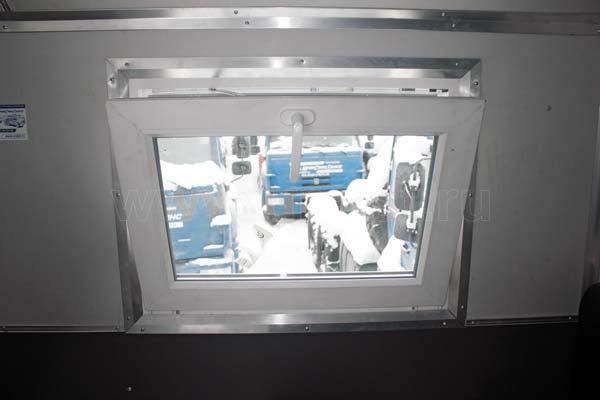 В левой панели фургона встроено окно-форточка, обеспечивающие естественное освещение, вентиляцию и необходимый обзор. Окно изготовлены с применением двойного герметичного стеклопакета из травмобезопасного стекла с уплотнителем толщиной 60 мм. В отсеке мастерской расположены два окна на скосах фургона для большей освещенности отсека. Окна на скосах окантованы двойным контуром высококачественного уплотнителя. В ночное время освещение кабины кузова-фургона электрическое от четырех плафонов.