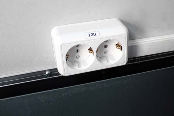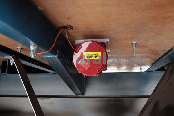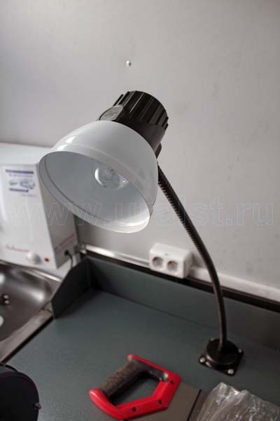 Фургон оборудован розетками для подключения потребителей 220 и 380V. Для работы в темное время суток все рабочие места фургона оборудованы плафонами освещения.