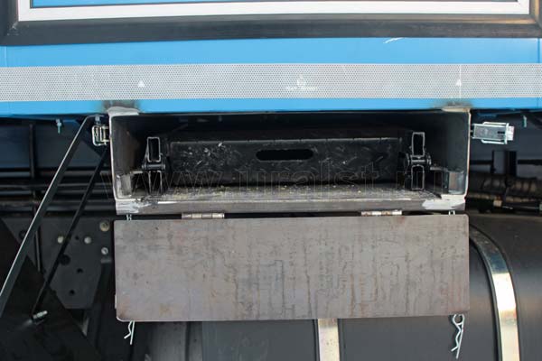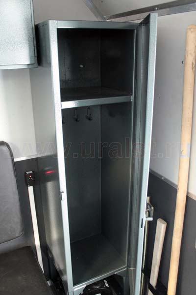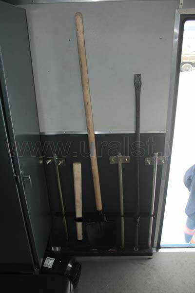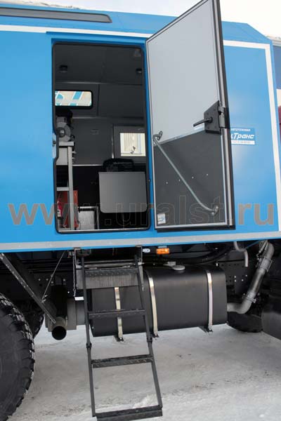 Еще одной особенностью фургона является двухсекционная раскладная лестница, по которой осуществляется вход персонала внутрь ремонтного отсека. Для удобства и экономии пространства лестница в транспортном положении убирается в нишу под полом кузова-фургона. Конструкция лестницы предусматривает широкие ступеньки, по которым легче производить спуск и подъем. Ступеньки изготовлены из стального рифленого листа, что исключает случайное соскальзывание ноги.