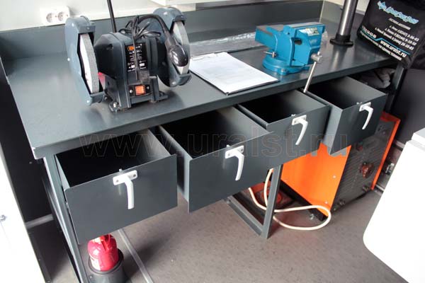 Применение высококачественных материалов и комплектующих при изготовлении, отделке и комплектации мастерской позволяют обеспечить высокий уровень проведения ремонтных работ. Просчитанная конструкция, высокое качество и износостойкость материалов, применяемых в отделке кузова-фургона обеспечивают надежность и долгий срок эксплуатации автофургона.