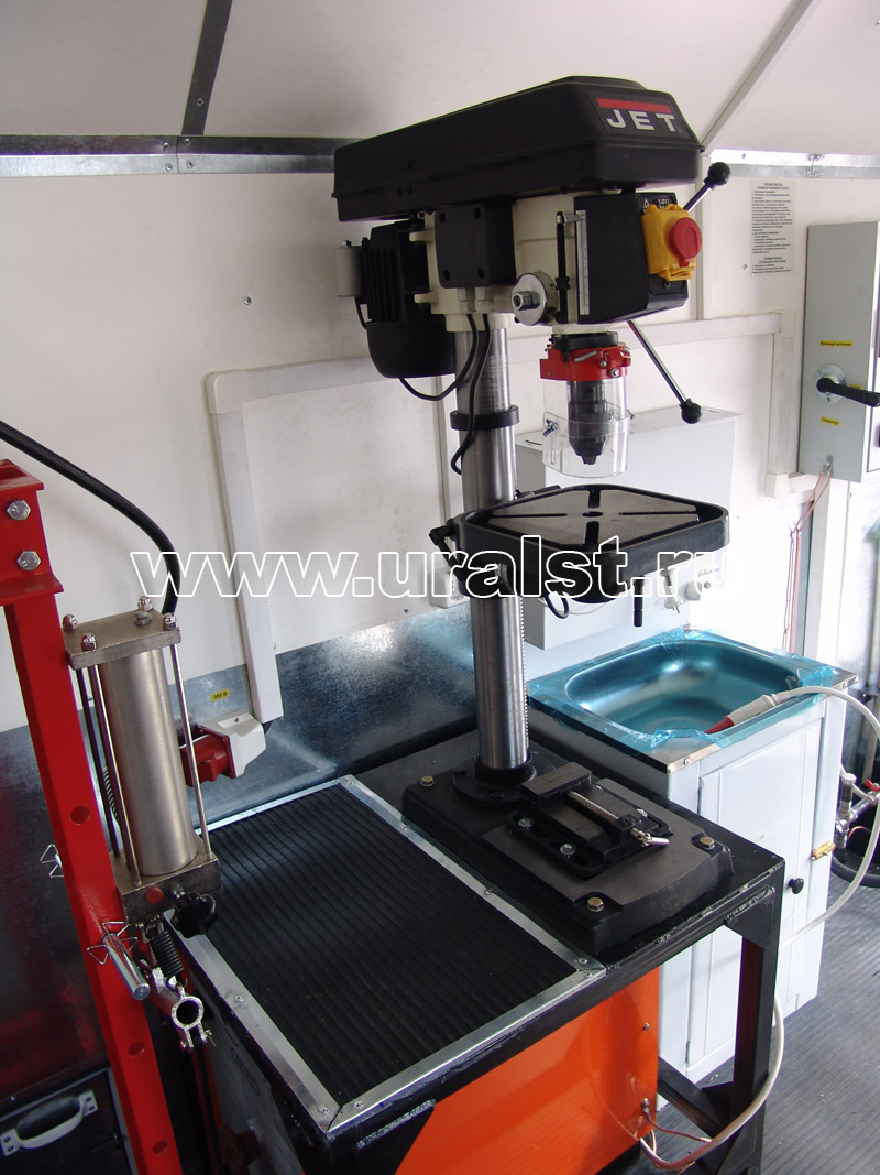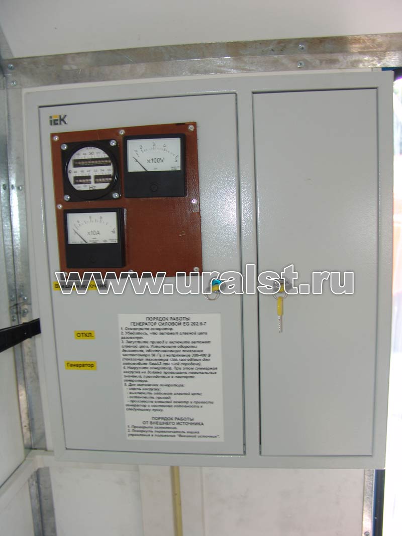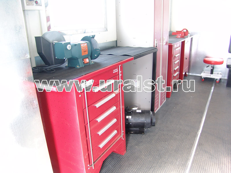 Все оборудование и инструмент надежно закреплено на штатных местах. К местам установки электрооборудования подведены розетки с напряжением 220 и 380 вольт. Электрооборудование передвижной мастерской питается от электрогенератора, расположенного под полом кузова-фургона, либо от внешнего источника, для подключения которого предусмотрен специальный разъем. Проводка выполняется медным кабелем расчетного сечения открыто в ПВХ коробах, которая сводится в отдельный электощит и заземляется.