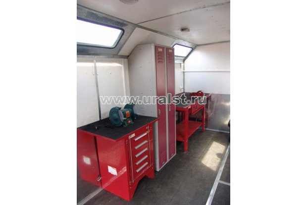 Передвижная авторемонтная мастерская оснащена верстаком с выдвижными ящиками и тисками слесарными, вертикально-сверлильным и точильно-шлифовальным станками, выпрямителями сварочными, сварочным и газорезательным оборудованием, кислородным и пропановым баллонами..