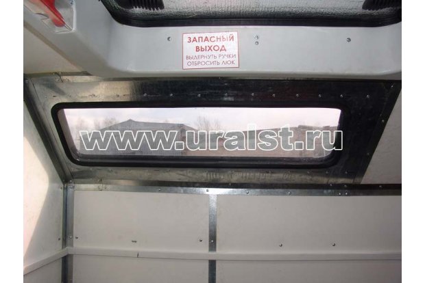 Двери обрамлены уплотнителем с двух сторон, что позволяет закрывать их с наибольшей герметичностью. Пол изготовлен из шпунтованной доски толщиной 30 мм, пенополистирольного утеплителя, фанеры и покрыт рифленой резиной (толщина пола составляет 60-90 мм). Вся древесина обработана огнебиозащитным составом. Окна с двойным остеклением, окантованные резиновым профилем в кол-ве 4 шт. расположены на скосах фургона.