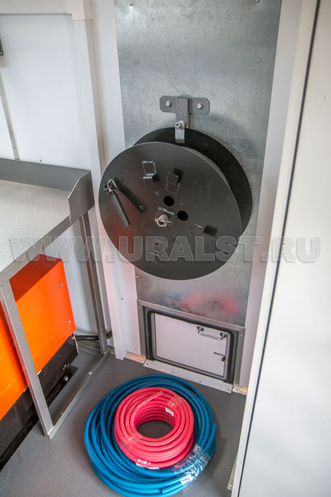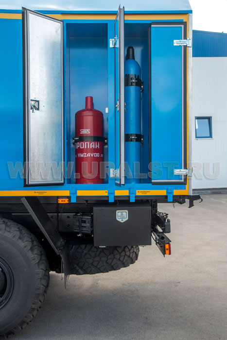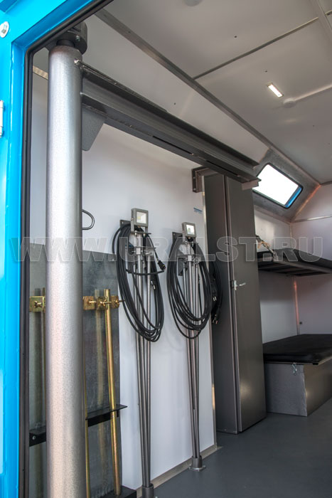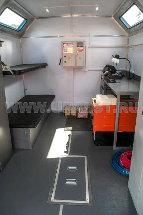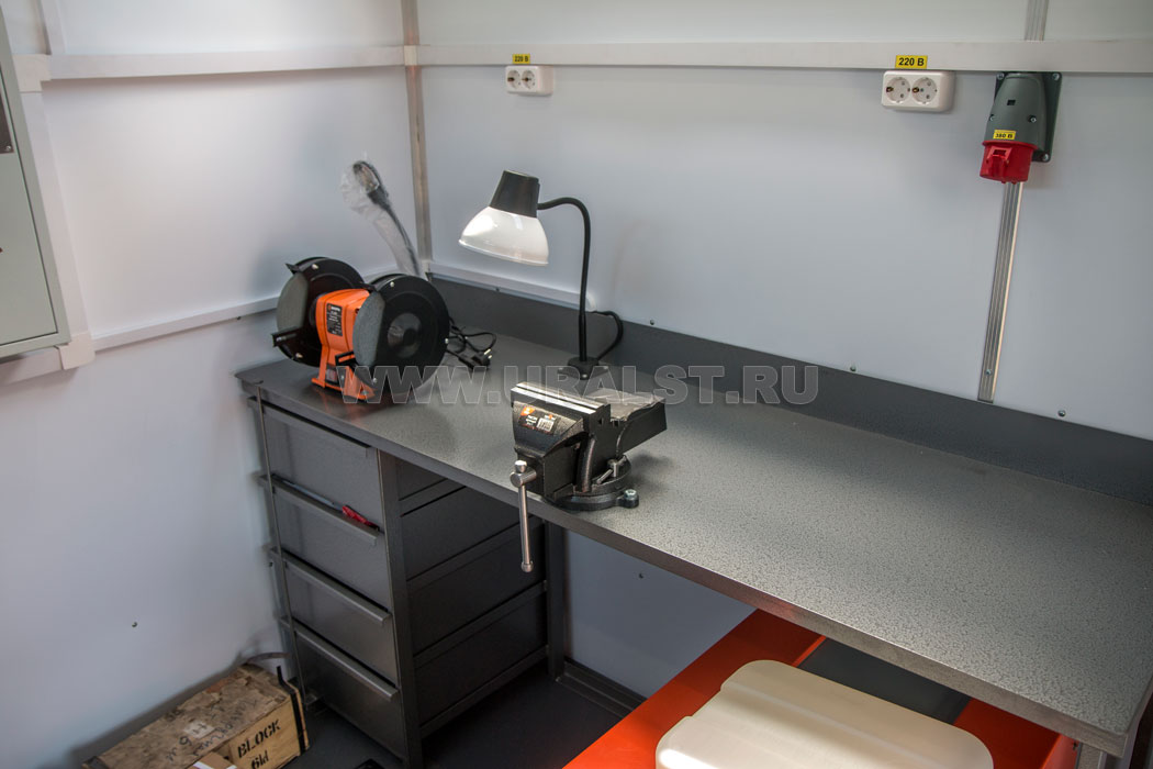 Особенностью передвижной авторемонтной мастерской производства компании "УралСпецТранс" являются специальные отсеки для хранения и транспортировки различного оборудования. Ниши позволяют увеличить рабочее пространство внутри кузова-фургона, а также внутри фургона на них можно разместить оборудование.