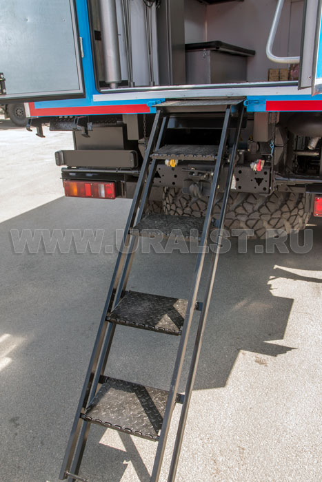 Вход персонала внутрь кузова-фургона ПАРМ, а также доступ к оборудованию в нишах, осуществляется по выдвижному трапу. Для удобства и экономии пространства трап в транспортном положении убираются в нишу под полом автофургона. Его конструкция предусматривает широкие ступеньки, по которым легче производить спуск и подъем. Ступеньки трапа изготовлены из стального листа с рифленой поверхностью, что исключает случайное соскальзование ноги.