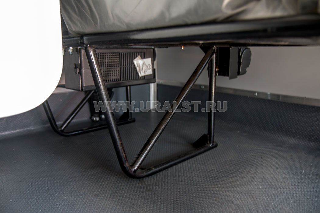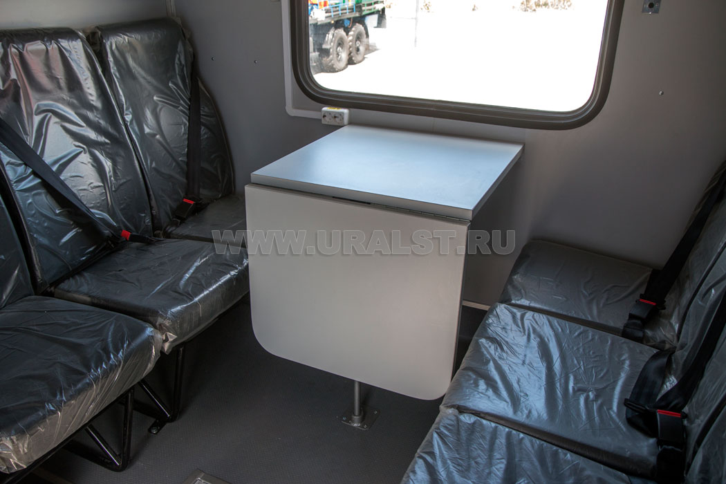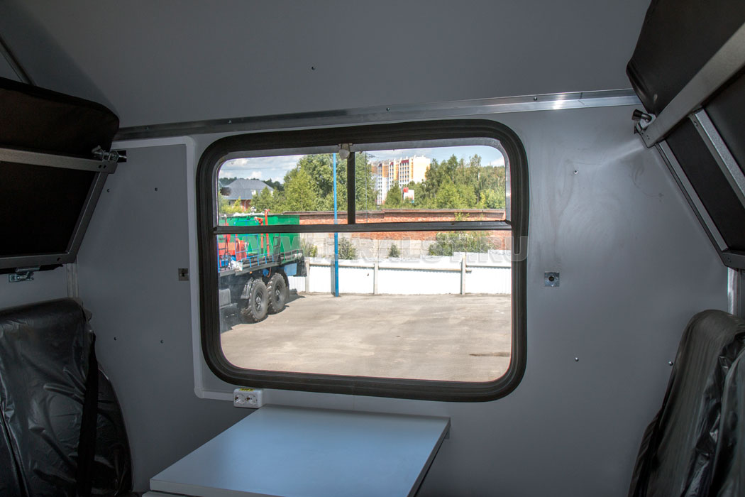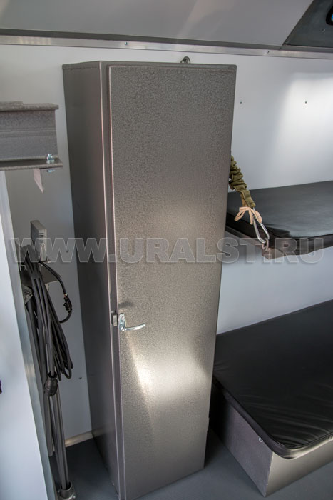 Выдвижные ящики, и открывающиеся дверцы имеют замки и фиксаторы, что предотвращает их открывание при перемещении автомобиля. Верстаки и шкафы изготовлены из высококачественных материалов, также имеют высококачественную фурнитуру. В кузове-фургоне размещен складной стол и диван рундук.