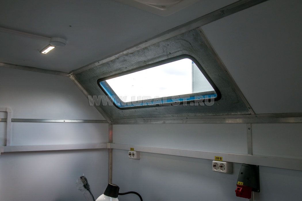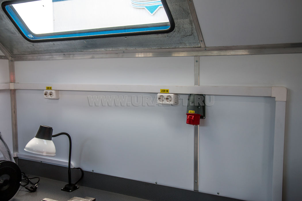 Напряжение 24В постоянного тока подается из электрической схемы базового автомобиля. Фургон комплектуются необходимым количеством светильников: обычно используются пыле- и влагозащищенные люминесцентные светильники. Возможна установка специальных светильников, исходя из требований для различных классов пожаровзрывобезопасности помещений.