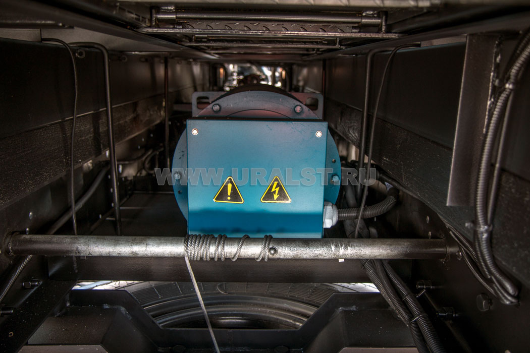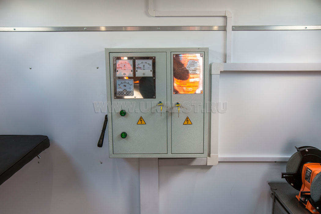 Питание оборудования передвижной мастерской Камаз осуществляется от генератора мощностью 38 кВА установленного на раме автомобиля под кузовом-фургоном, а также от внешнего источника питания, для подключения которого предусмотрен специальный разъем.