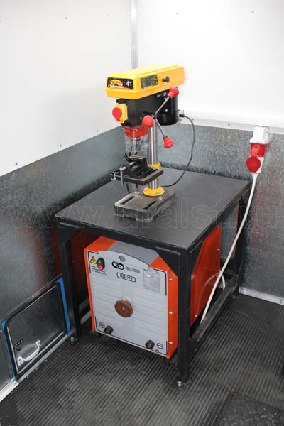Передвижная авторемонтная мастерская оснащена верстаком с выдвижными ящиками и тисками слесарными, вертикально-сверлильным и точильно-шлифовальным станками, выпрямителями сварочными, сварочным и газорезательным оборудованием.