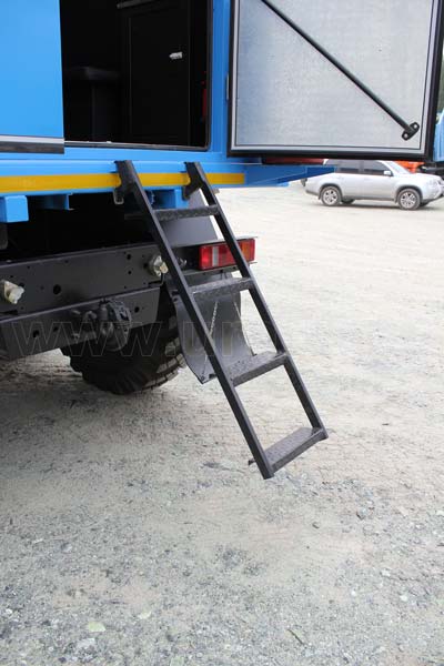 Еще одной особенностью мастерской является съемная лестница, по которой осуществляется вход персонала и перемещение грузов внутрь фургона. Для удобства и экономии пространства лестница в транспортном положении убирается в нишу под полом фургона. Конструкция лестницы предусматривает широкие ступеньки, по которым легче производить спуск и подъем внутрь фургона.